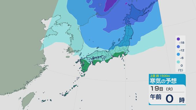 19日(火)の未明には、石川県など北陸は地上で雪が降る目安とされる-6度以下の寒気に覆われています。