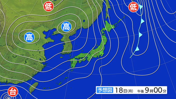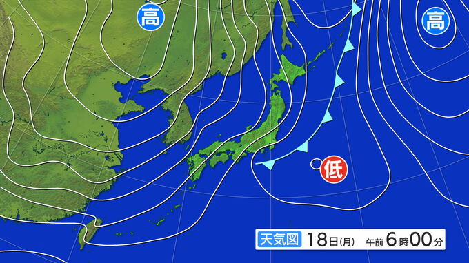 18日午前6時の天気図です。日本の東海上には低気圧があり、大陸には高気圧があります。西高東低の気圧配置になっています。