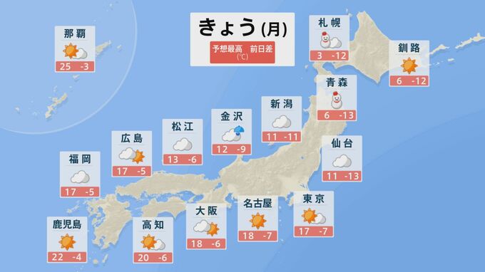 19日は強い寒気の影響で北陸や東北では最高気温が10度を下回るところもでしょう。