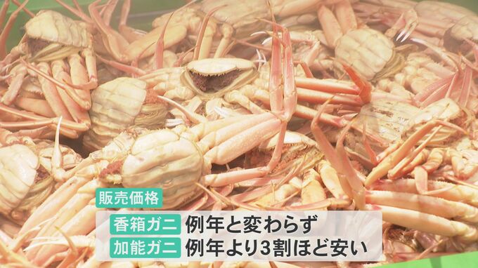 上島商店・山岸礼さん「びっくりしました。ぼくらもそうですよ。カニの解禁日の2日はちょっと高めだったんですけど、その後になったらものすごく安くなってたんで、正直びっくりしました。今年は本当に特に安くて、加能ガニですね。特に安いのは去年の3割ほどお安い値段で提供させていただいております」