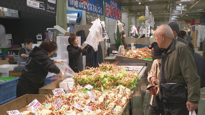 ここ数日は、メスの香箱ガニの価格は例年並みですが、オスの加能ガニは3割ほど安く、連日、山積みのカニが売り切れる盛況ぶりだということです。