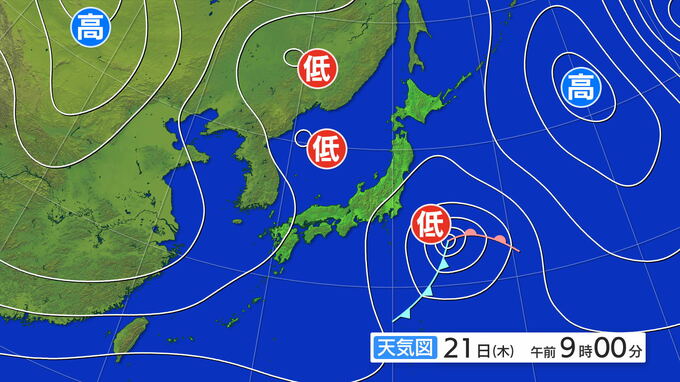 21日午前9時の天気図です。関東の南東海上にある低気圧は東へと抜けるでしょう。