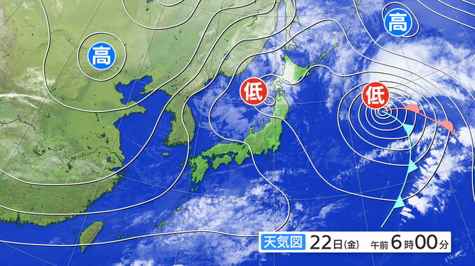22日午前6時の天気図です。東北近海の日本海に低気圧があり東へと進むでしょう。
