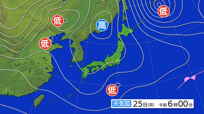 25日(月)午前6時の天気図です。沿海州に高気圧があります。南よりに進み、日中は日本列島は広く高気圧に覆われそうです。