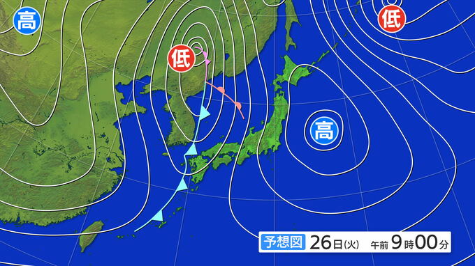 ただ、日ざしがあるのは25日一日限りになりそうです。26日(火)午前9時の予想天気図を見ると、朝鮮半島の北に前線をともなった低気圧があります。