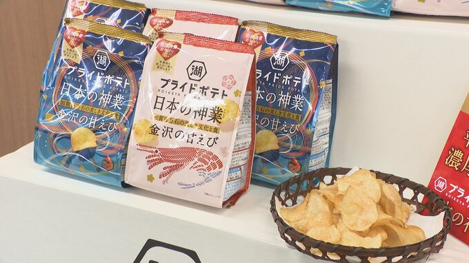 大手菓子メーカーの湖池屋では、ことしもポテトチップスの商品として「日本の神業 金沢の甘えび」を展開し、パッケージには金沢美大の学生が考えたデザインが採用されました。食品にはあまり使われない青色をパッケージに採用するなど、学生らしい独創的な発想も目を引きます。