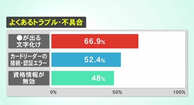 このうち最も多かったのは「文字化け」で66.9%、このほかカードリーダーの接続エラーや、資格情報が「無効」と表示されたりするトラブルが多かったということです。