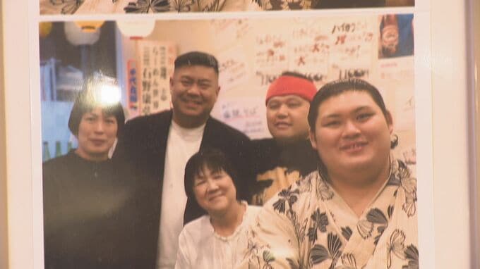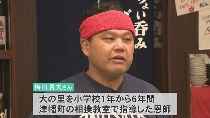 店主の梅田貴夫さんは大の里を小学校1年から6年間、津幡町の相撲教室で指導した恩師です。経営する居酒屋の店内には写真や色紙などが飾られています。