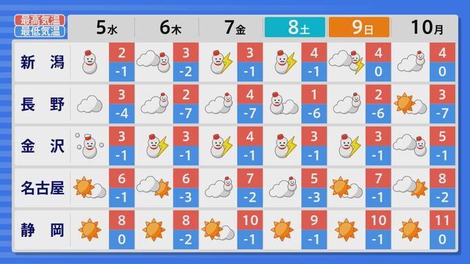 5日(水)にかけても雪の降り方は強く、1週間を通して雪の降りやすい天気になりそうです。