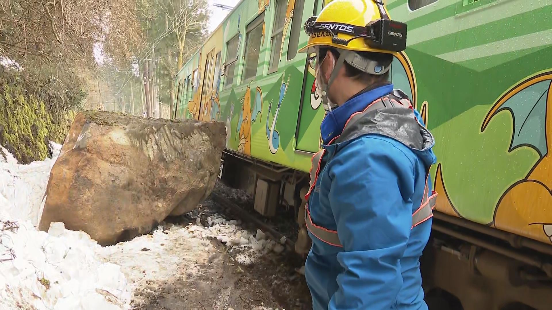 この事故のため、えちぜん鉄道は午前9時現在山王(さんのう)駅と勝山駅の間で運転を見合わせ福井駅と山王駅の間の折り返し運転を行っています。線路上の落石はたて・横1メートル50センチくらいで列車は左側の前の部分が衝撃でゆがんだほか運転席のガラスにひびが入りました。