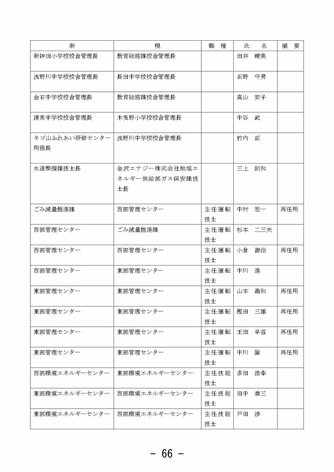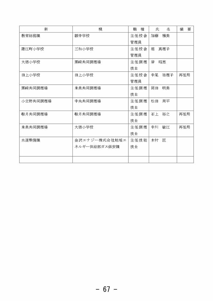 金沢市 市職員人事異動 「市長室」を新設し情報発信強化 室長に次長級職員を配置【2025年度 令和7年度 全員掲載】 2025年3月26日(水) 10:33 石川 金沢市職員人事異動 【技能労務職】 技能労務職(金沢市発表) 技能労務職(金沢市発表) 技能労務職(金沢市発表)