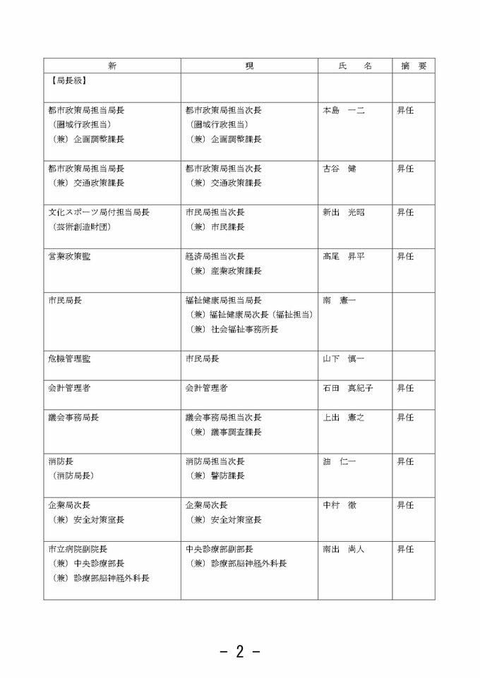 金沢市 市職員人事異動 「市長室」を新設し情報発信強化 室長に次長級職員を配置【2025年度 令和7年度 全員掲載】 2025年3月26日(水) 10:33 石川 金沢市職員人事異動 【特別職・局長級】 特別職(金沢市発表) 局長級(金沢市発表) 局長級(金沢市発表)
