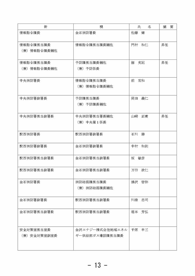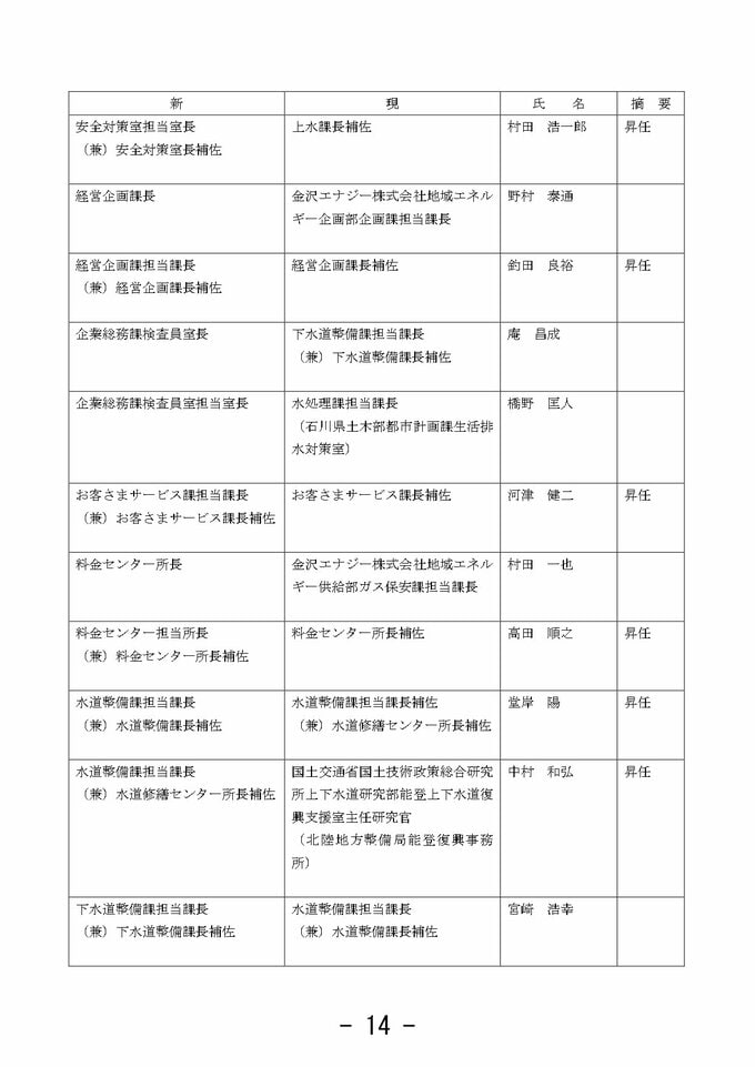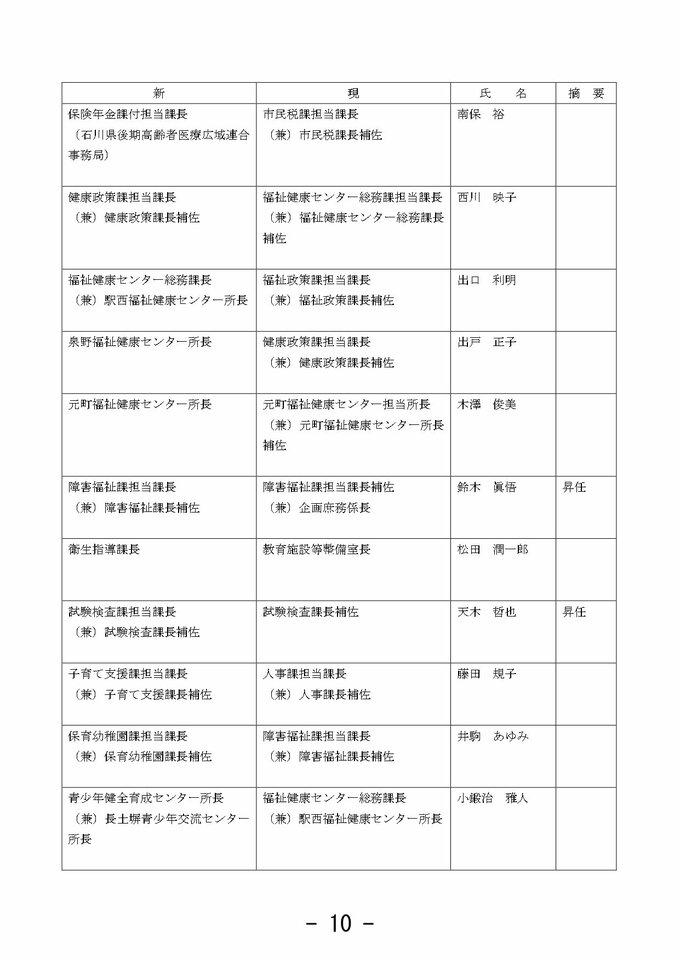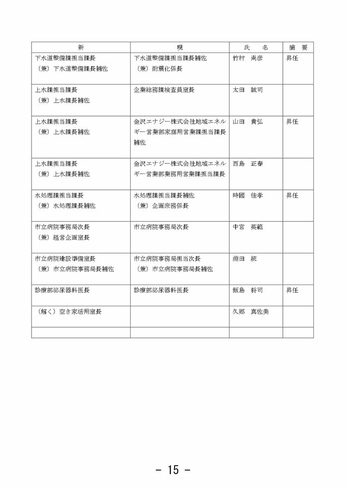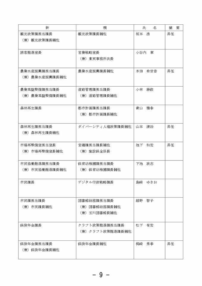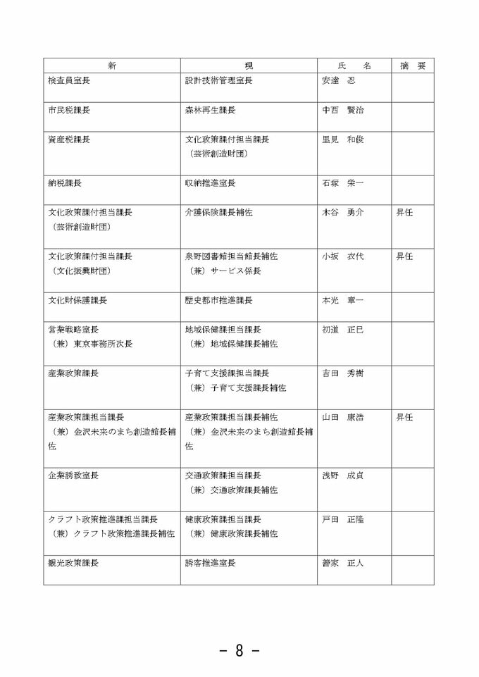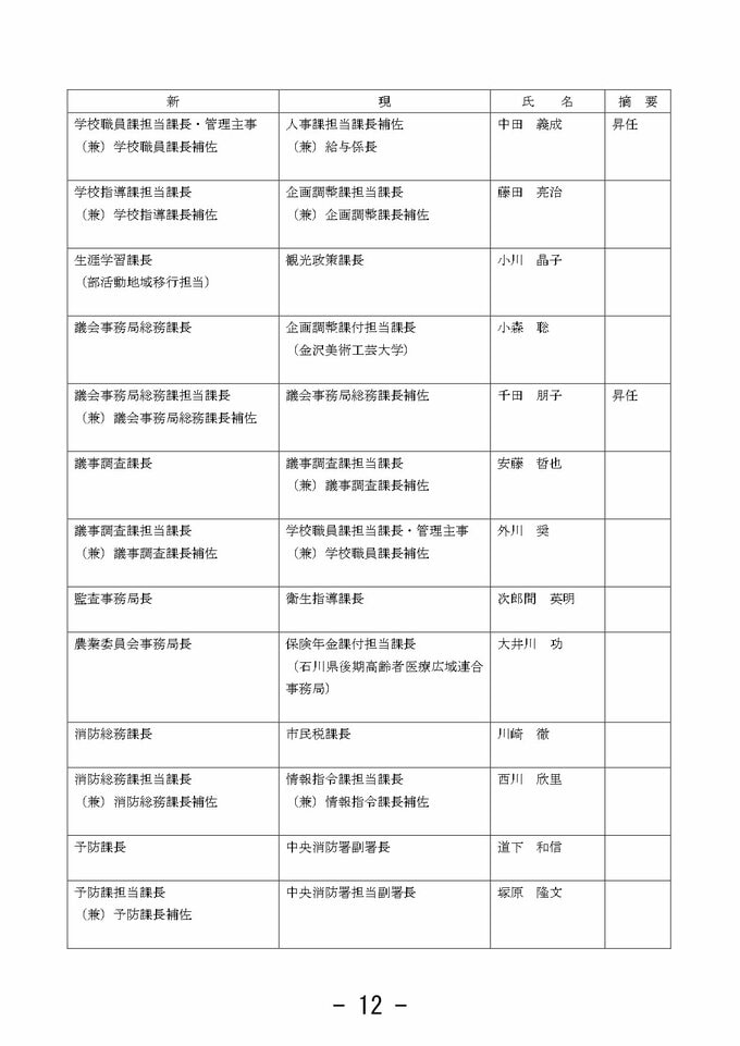 金沢市 市職員人事異動 「市長室」を新設し情報発信強化 室長に次長級職員を配置【2025年度 令和7年度 全員掲載】 2025年3月26日(水) 10:33 石川 金沢市職員人事異動 【課長級】 課長級(金沢市発表) 課長級(金沢市発表) 課長級(金沢市発表) 課長級(金沢市発表) 課長級(金沢市発表) 課長級(金沢市発表) 課長級(金沢市発表) 課長級(金沢市発表) 課長級(金沢市発表)