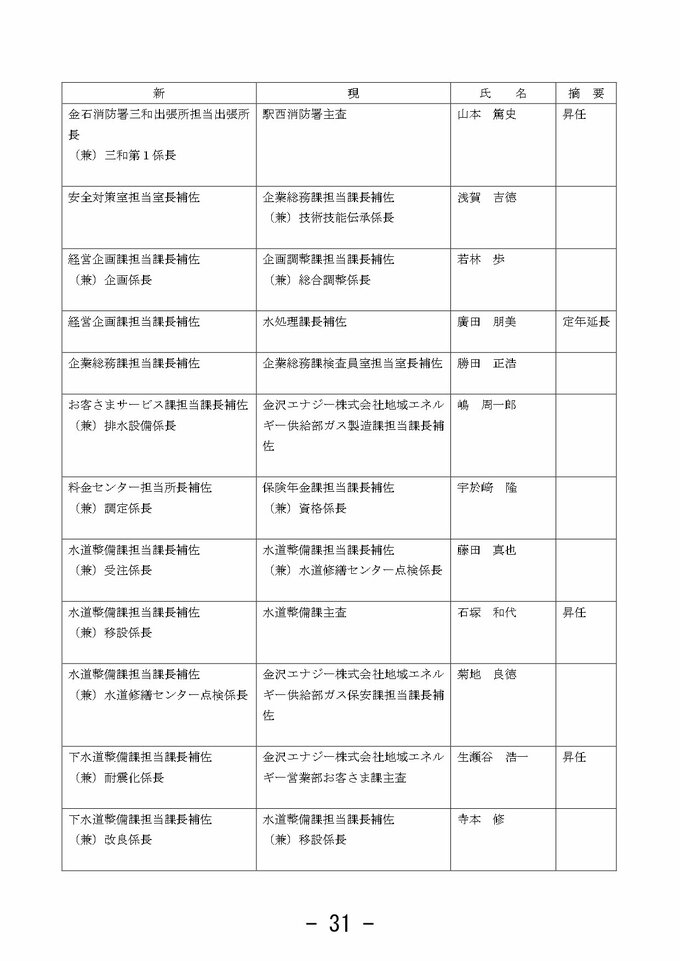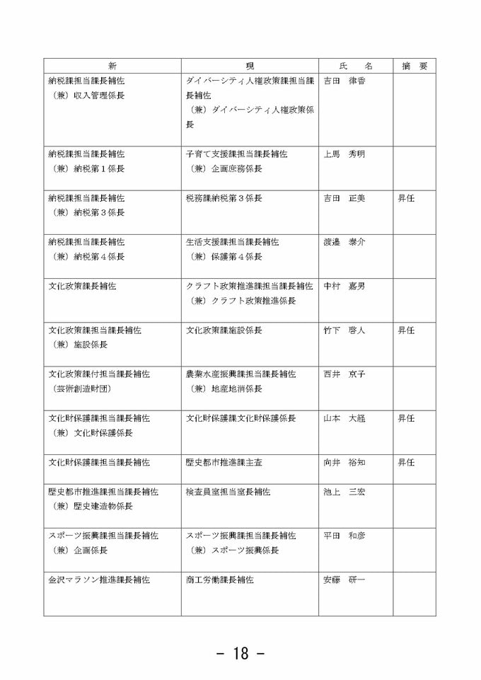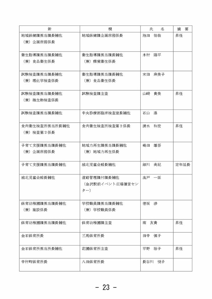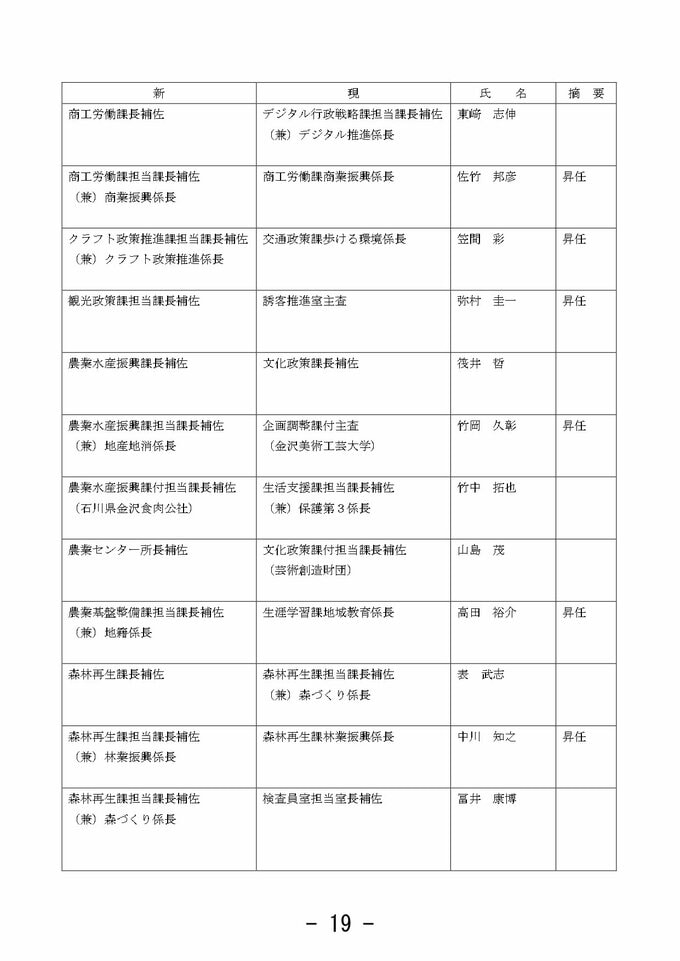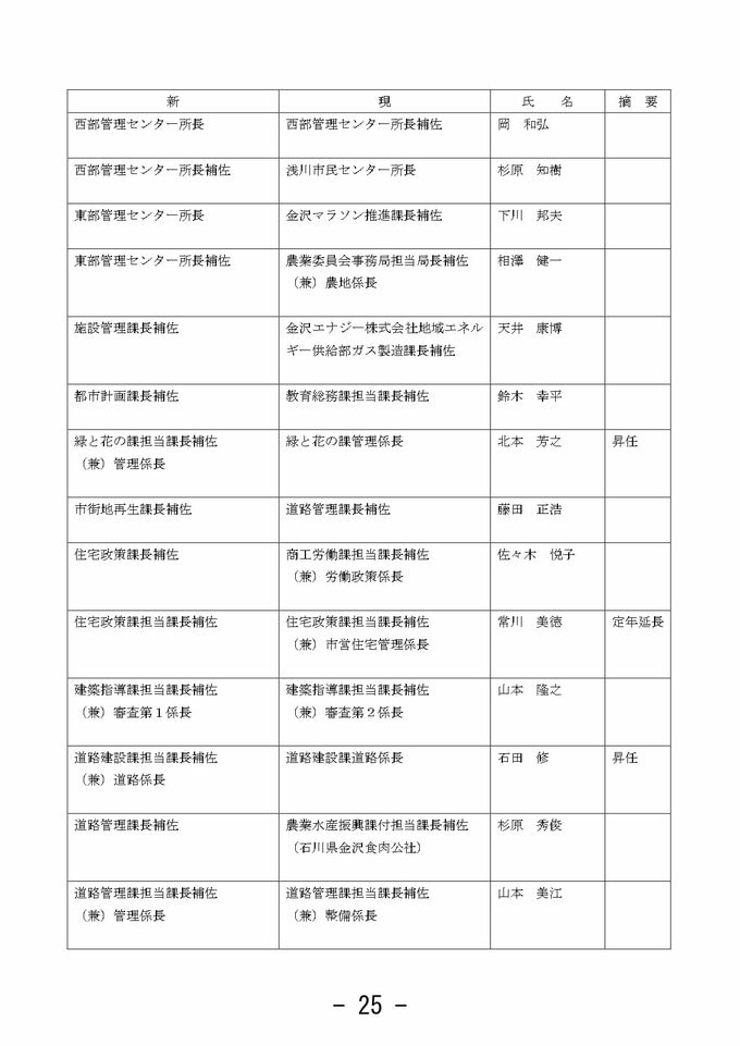 金沢市 市職員人事異動 「市長室」を新設し情報発信強化 室長に次長級職員を配置【2025年度 令和7年度 全員掲載】 2025年3月26日(水) 10:33 石川 金沢市職員人事異動 【課長補佐級】 課長補佐級(金沢市発表) 課長補佐級(金沢市発表) 課長補佐級(金沢市発表) 課長補佐級(金沢市発表) 課長補佐級(金沢市発表) 課長補佐級(金沢市発表) 課長補佐級(金沢市発表) 課長補佐級(金沢市発表) 課長補佐級(金沢市発表) 課長補佐級(金沢市発表) 課長補佐級(金沢市発表) 課長補佐級(金沢市発表) 課長補佐級(金沢市発表) 課長補佐級(金沢市発表) 課長補佐級(金沢市発表) 課長補佐級(金沢市発表) 課長補佐級(金沢市発表) 課長補佐級(金沢市発表)