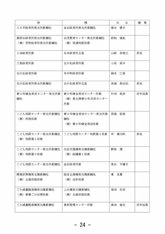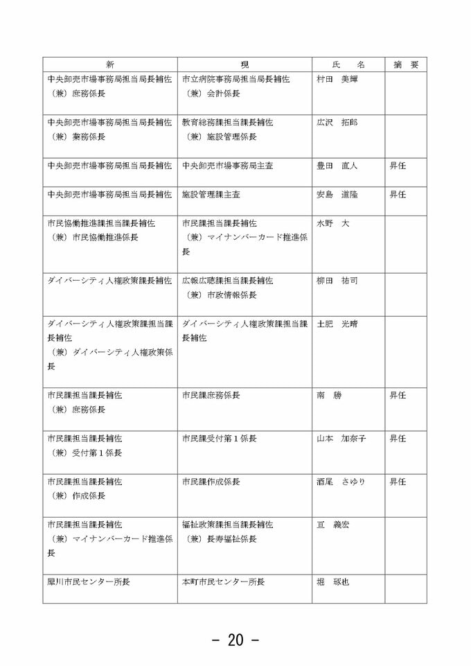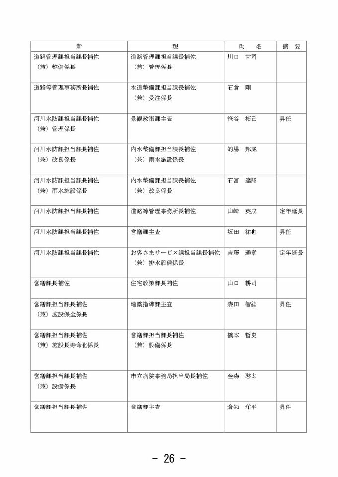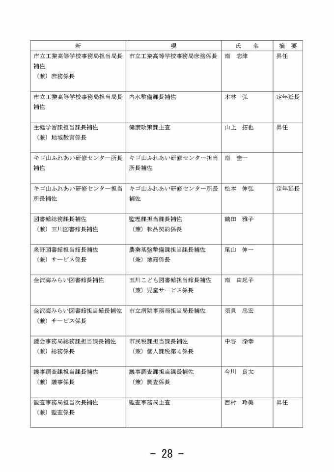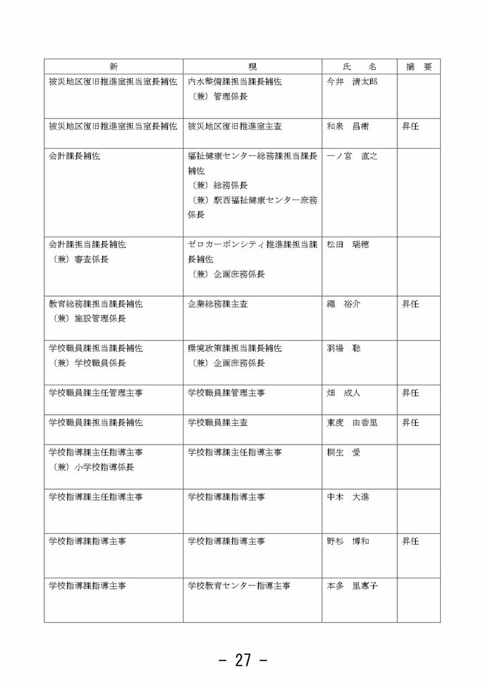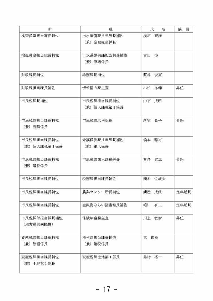 金沢市 市職員人事異動 「市長室」を新設し情報発信強化 室長に次長級職員を配置【2025年度 令和7年度 全員掲載】 2025年3月26日(水) 10:33 石川 金沢市職員人事異動 【課長補佐級】 課長補佐級(金沢市発表) 課長補佐級(金沢市発表) 課長補佐級(金沢市発表) 課長補佐級(金沢市発表) 課長補佐級(金沢市発表) 課長補佐級(金沢市発表) 課長補佐級(金沢市発表) 課長補佐級(金沢市発表) 課長補佐級(金沢市発表) 課長補佐級(金沢市発表) 課長補佐級(金沢市発表) 課長補佐級(金沢市発表) 課長補佐級(金沢市発表) 課長補佐級(金沢市発表) 課長補佐級(金沢市発表) 課長補佐級(金沢市発表) 課長補佐級(金沢市発表) 課長補佐級(金沢市発表)