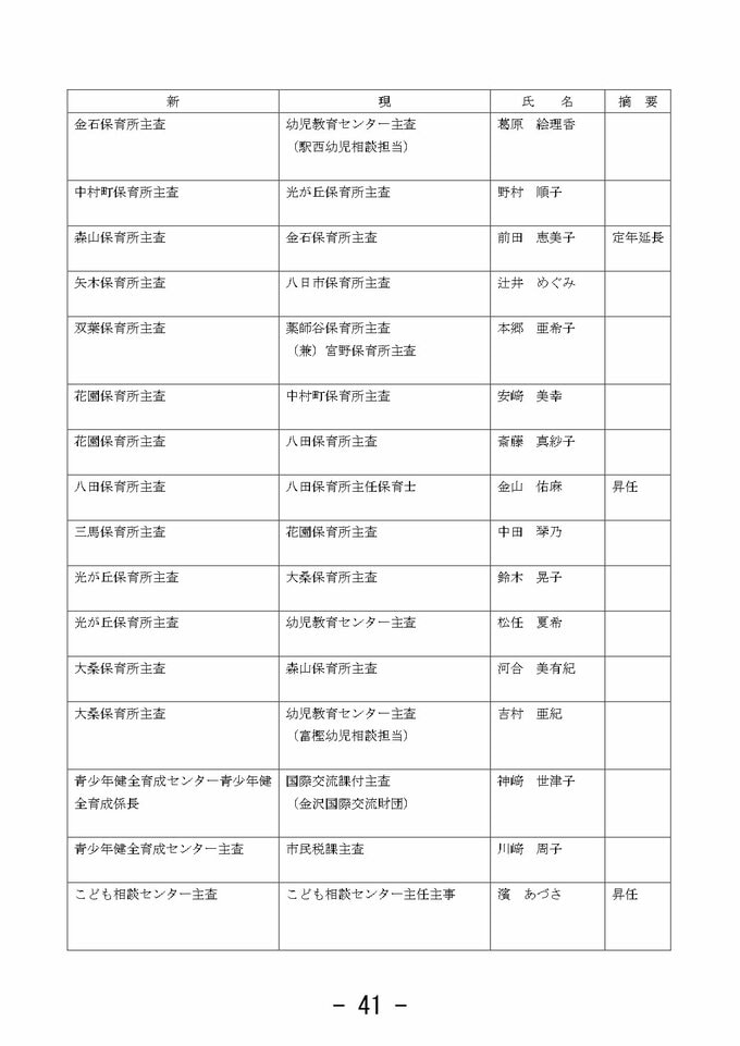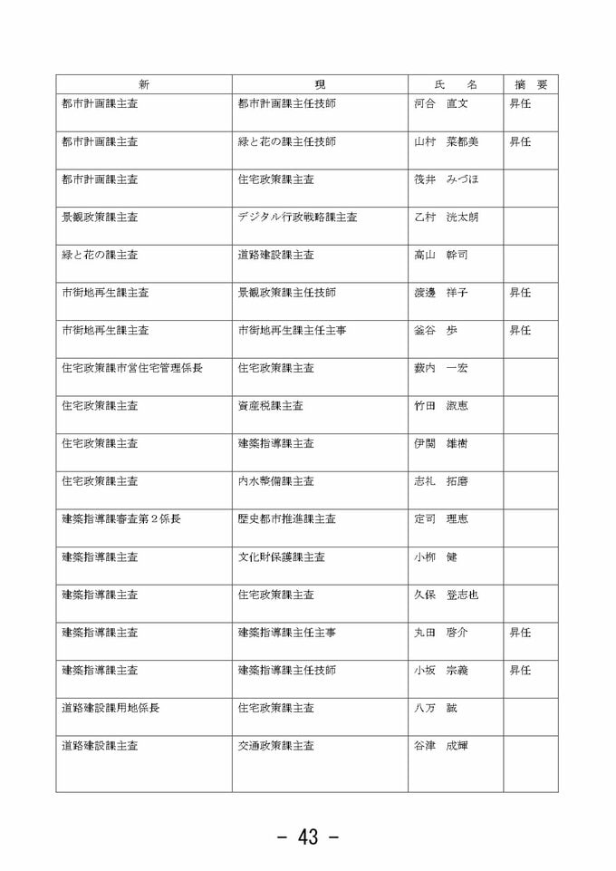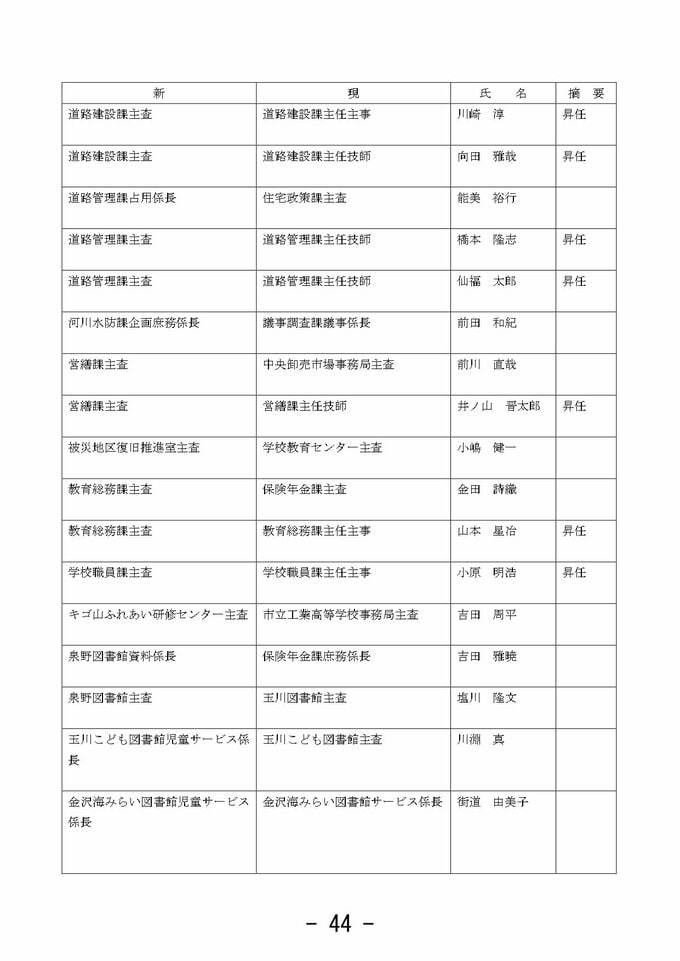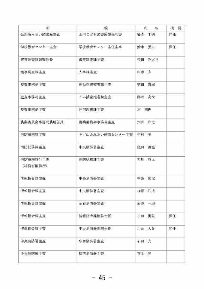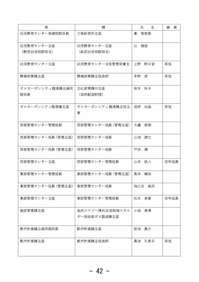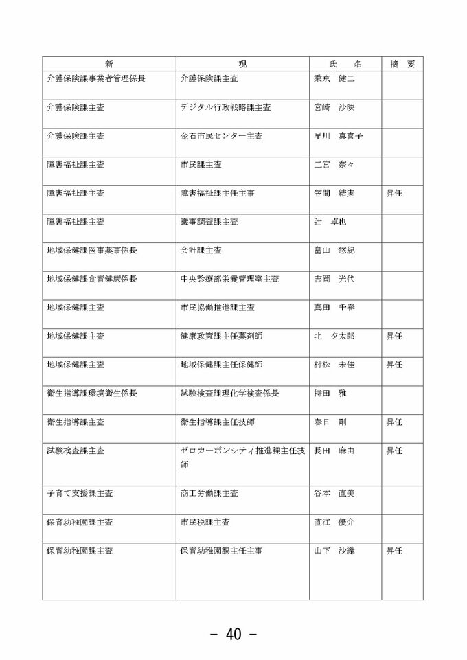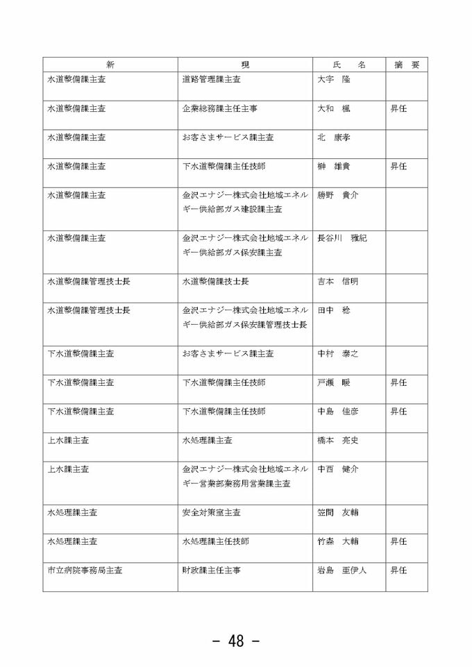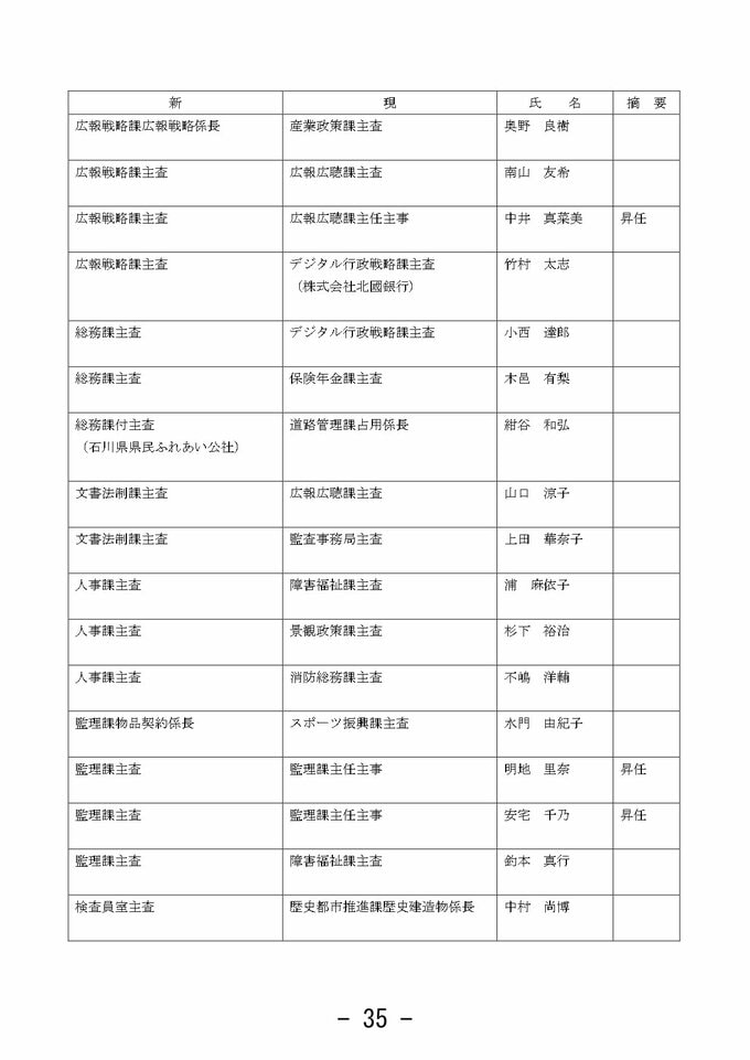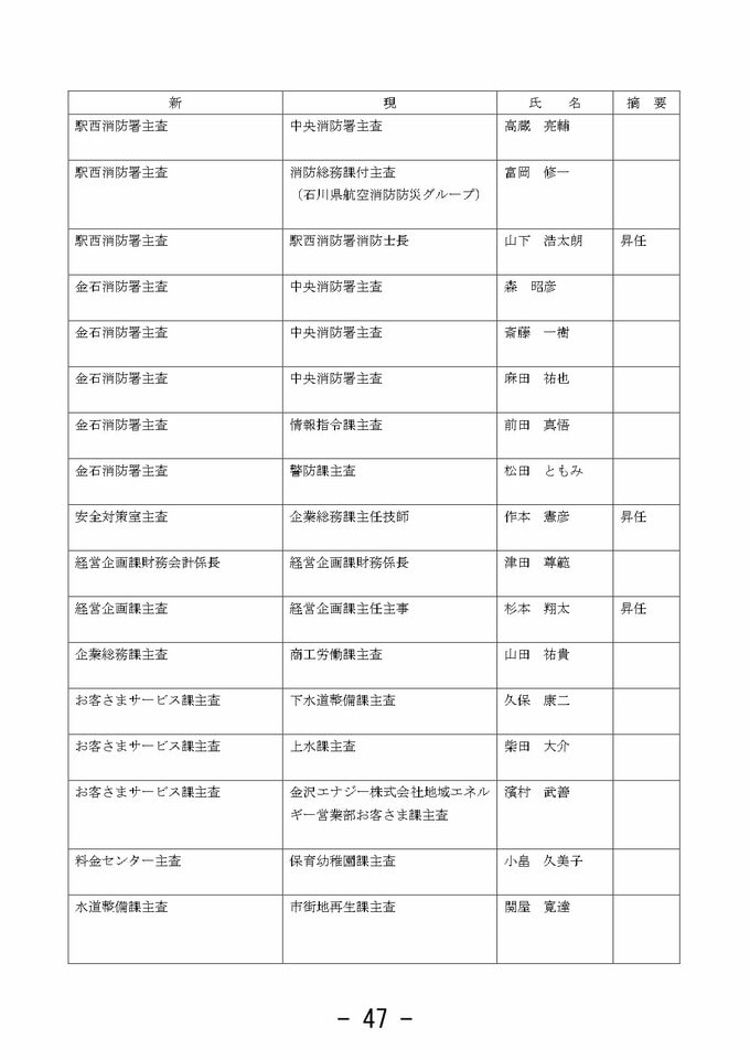 金沢市 市職員人事異動 「市長室」を新設し情報発信強化 室長に次長級職員を配置【2025年度 令和7年度 全員掲載】 2025年3月26日(水) 10:33 石川 金沢市職員人事異動 【主査級】 主査級(金沢市発表) 主査級(金沢市発表) 主査級(金沢市発表) 主査級(金沢市発表) 主査級(金沢市発表) 主査級(金沢市発表) 主査級(金沢市発表) 主査級(金沢市発表) 主査級(金沢市発表) 主査級(金沢市発表) 主査級(金沢市発表) 主査級(金沢市発表) 主査級(金沢市発表) 主査級(金沢市発表) 主査級(金沢市発表) 主査級(金沢市発表) 主査級(金沢市発表)