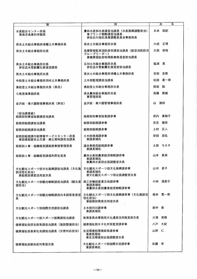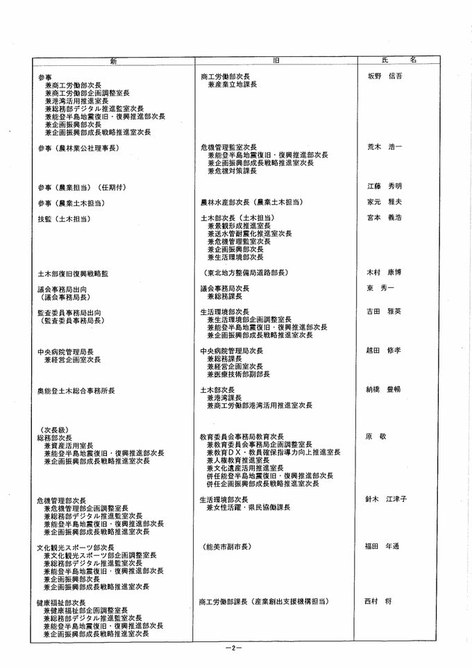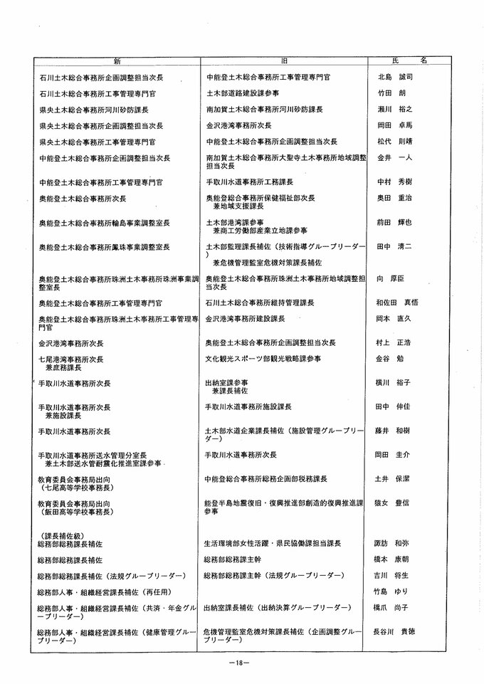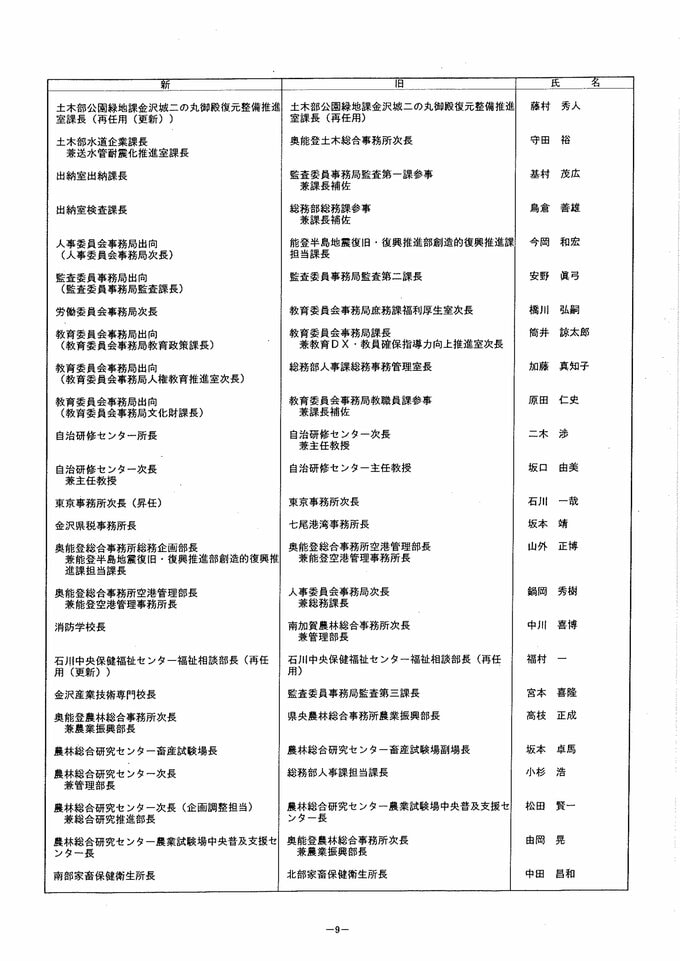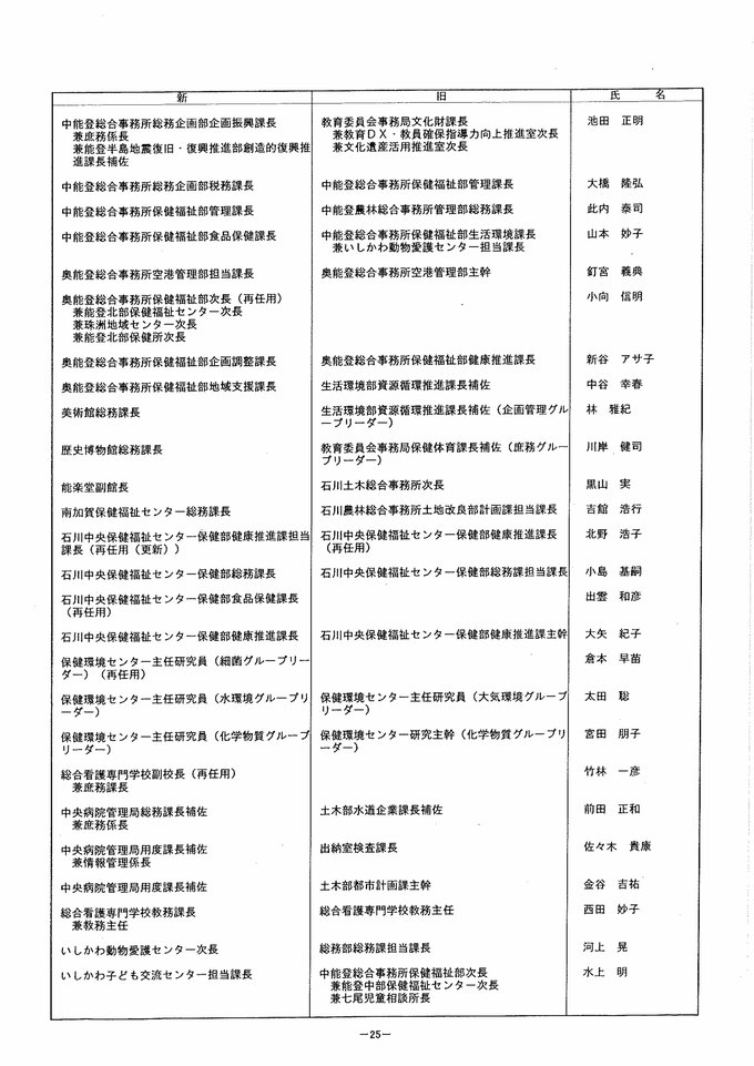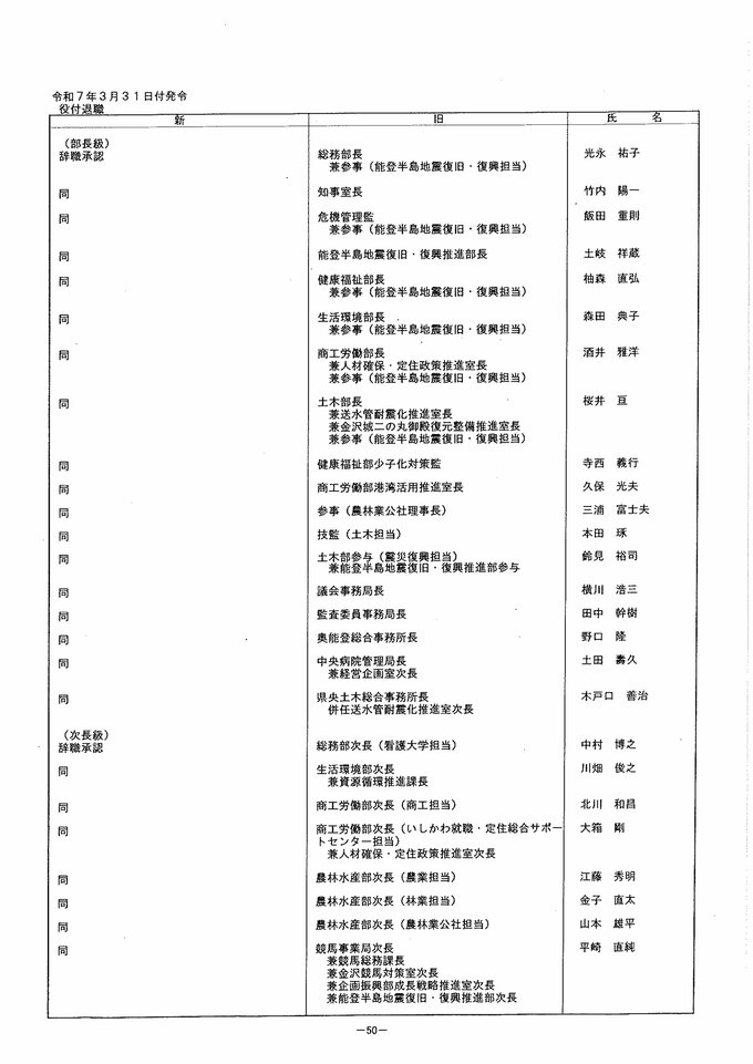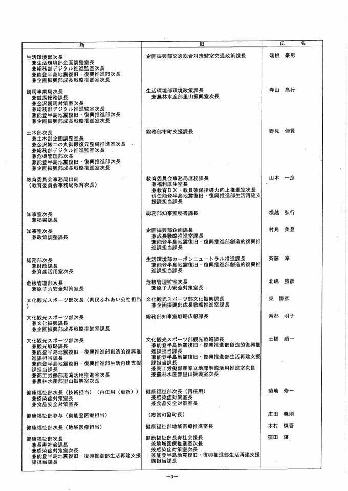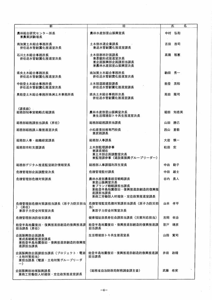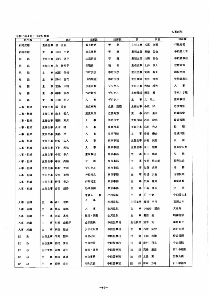 石川県 県職員人事異動 女性管理職が過去最多の15.4% 災害対応力強化へ 危機管理監室を「危機管理部」に改組【2025年度 令和7年度 全員掲載】 2025年3月27日(木) 18:00 石川 【画像】石川県職員の人事異動一覧