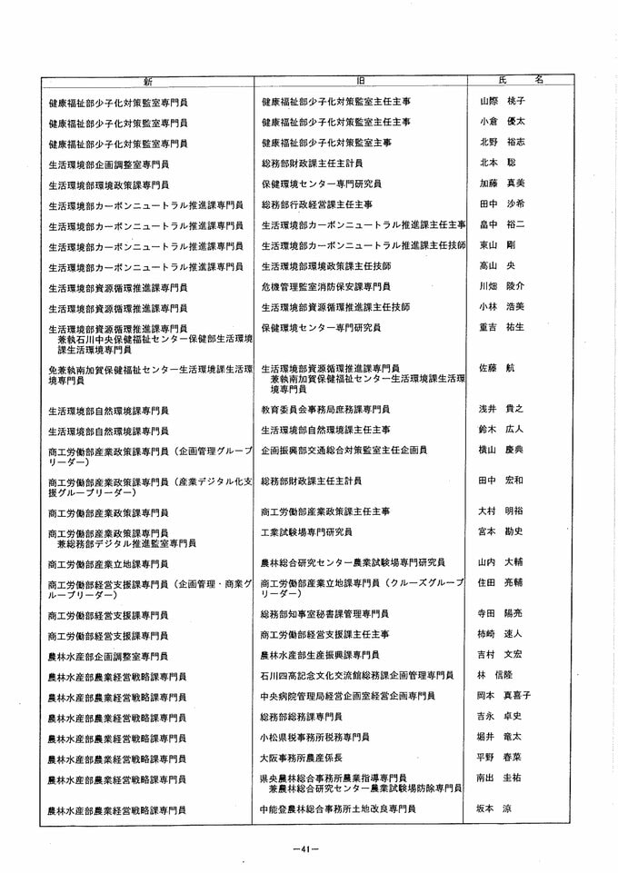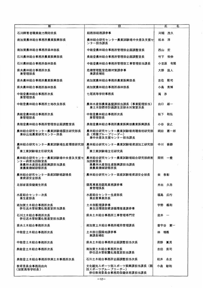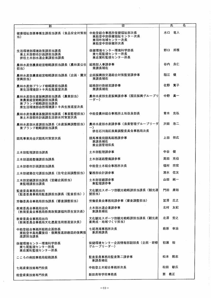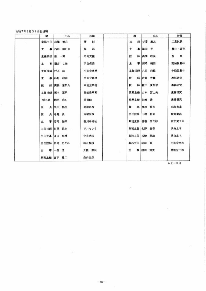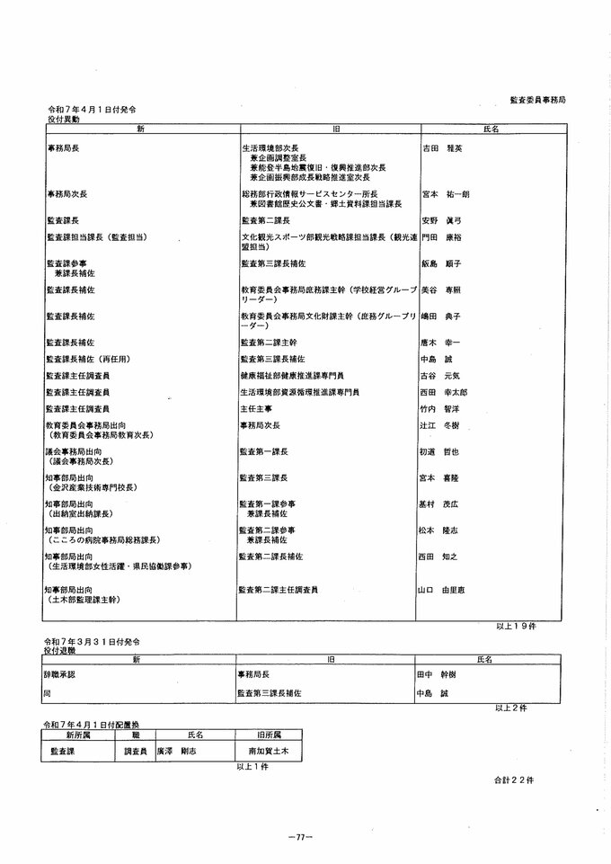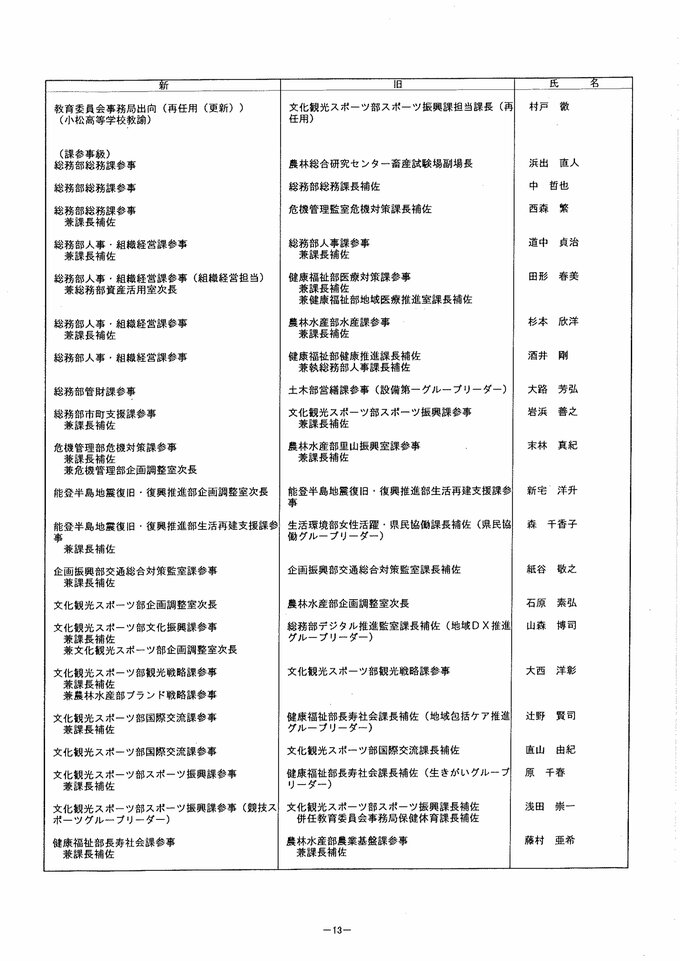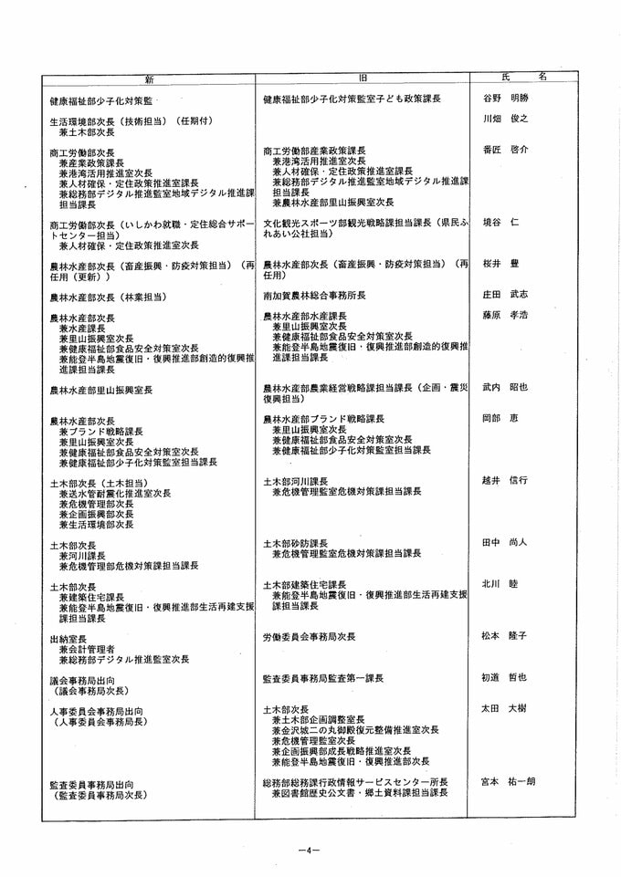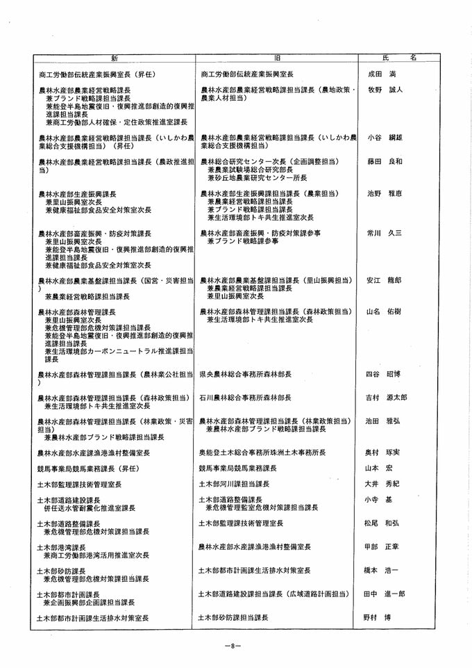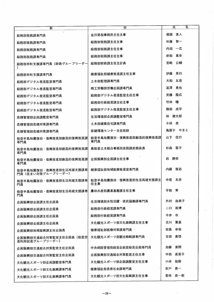 石川県 県職員人事異動 女性管理職が過去最多の15.4% 災害対応力強化へ 危機管理監室を「危機管理部」に改組【2025年度 令和7年度 全員掲載】 2025年3月27日(木) 18:00 石川 【画像】石川県職員の人事異動一覧