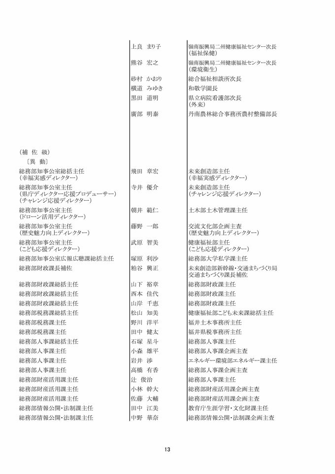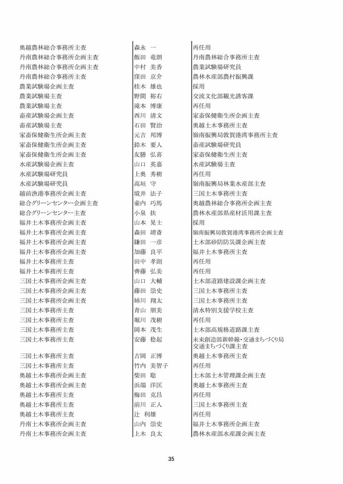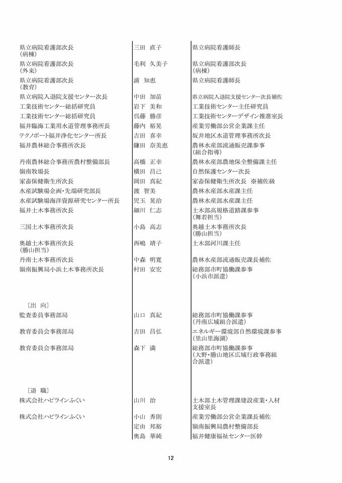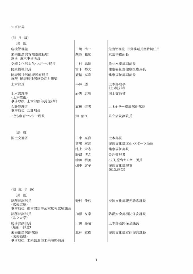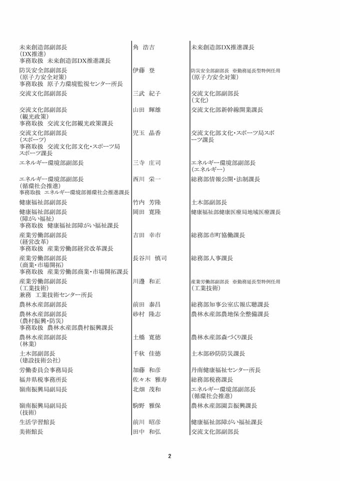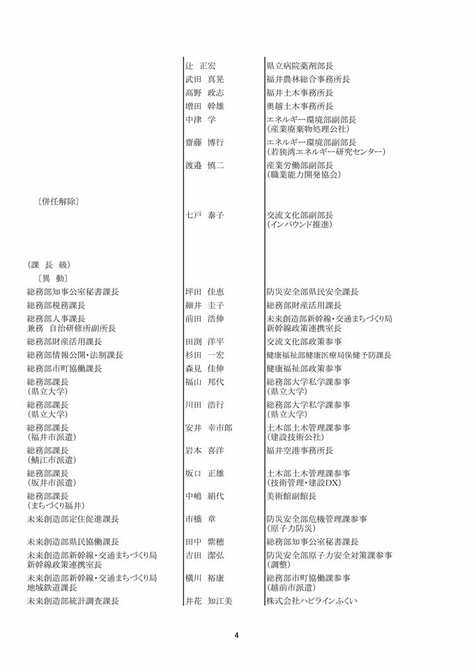 福井県 県職員人事異動 「インバウンド交流課」など観光3課を新設!女性管理職が過去最多の127人で25%越え【2025年度 令和7年度 全員掲載】 2025年4月1日(火) 17:49 福井 福井県職員人事異動 【知事部局】