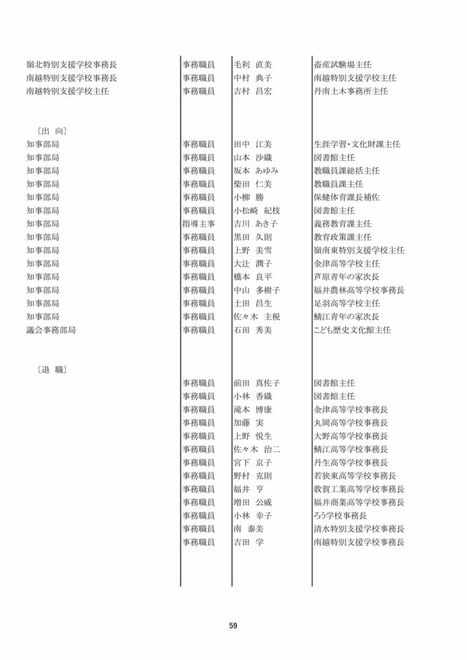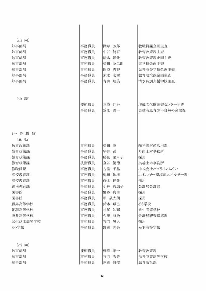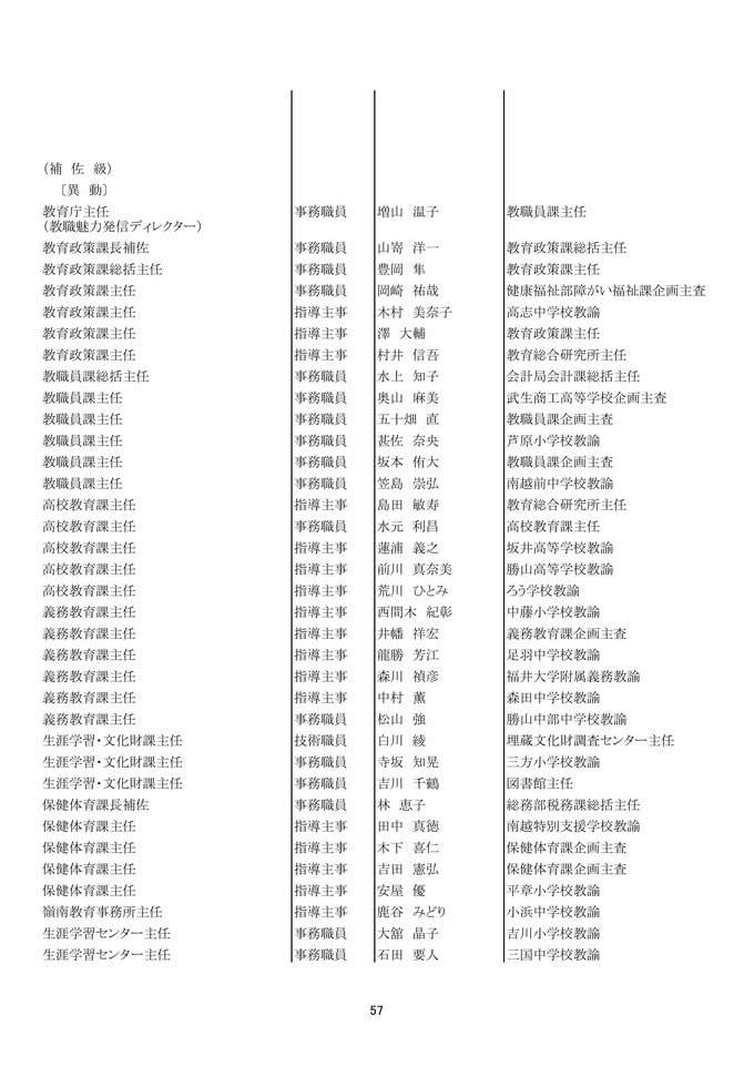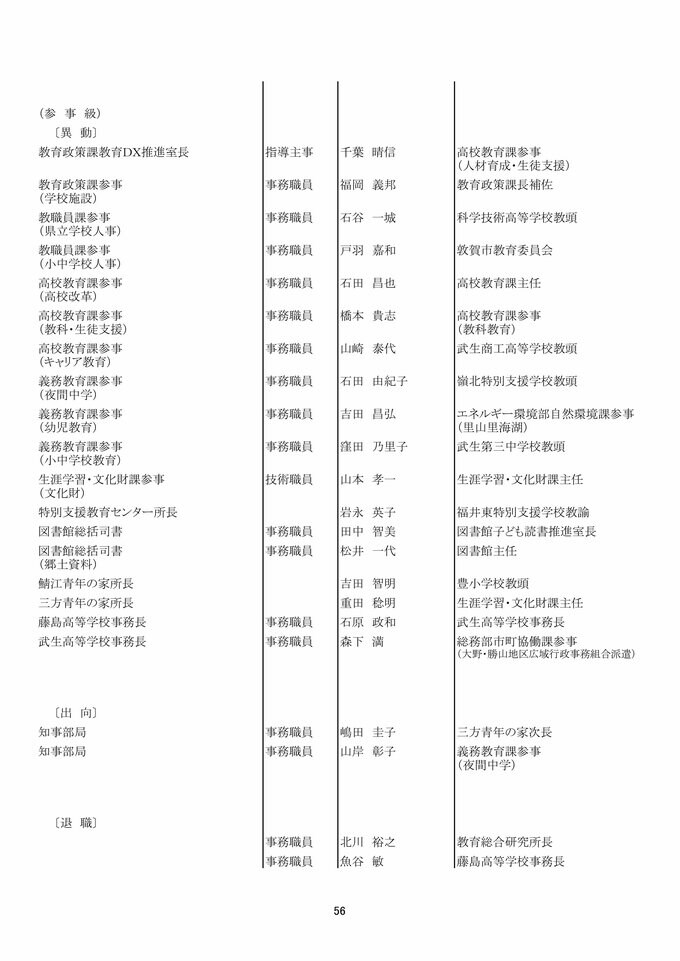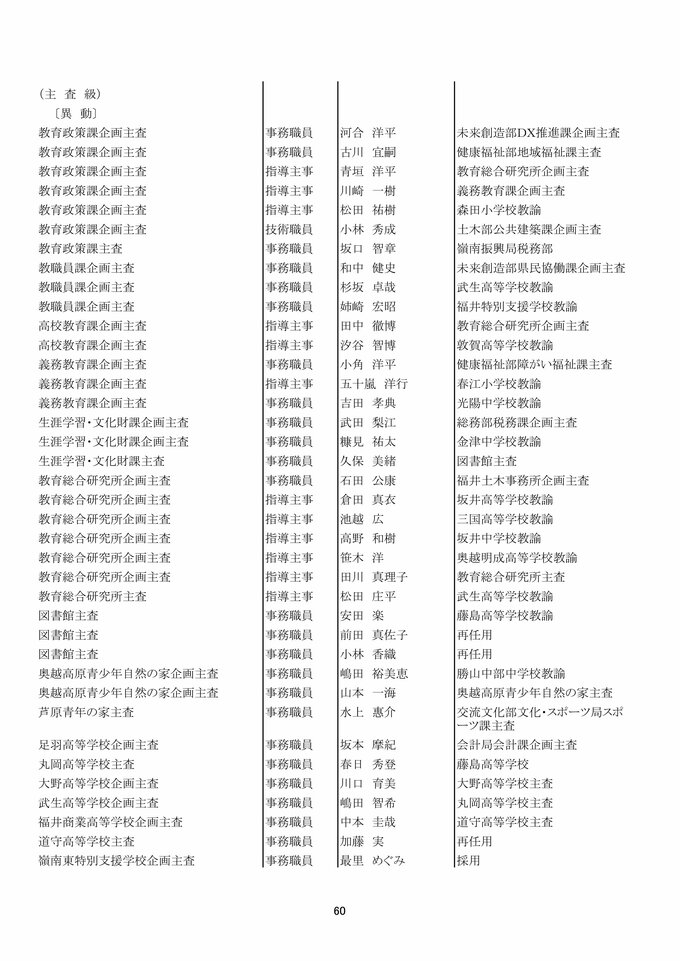 福井県 県職員人事異動 「インバウンド交流課」など観光3課を新設!女性管理職が過去最多の127人で25%越え【2025年度 令和7年度 全員掲載】 2025年4月1日(火) 17:49 福井 福井県職員人事異動 【教育委員会】