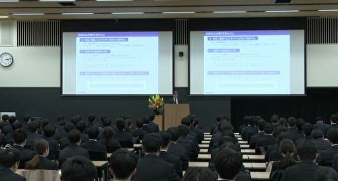 富山県氷見市出身・西田祐眞さん「社長とかの話を聞いてようやくコマツの一員になれたんだなっていう気持ちでいっぱいで、とても実感が湧いてきました」金沢市出身・奥村慎太郎さん「コマツの新しい価値を生み出すというのに惹かれて入社したので、挑戦して、新しい価値を社会に届けていけるような仕事に取り組みたいと思っています」小松市出身・沢田七虹さん「何事もまず行動することを目標にこれから頑張っていきたいと思っております」