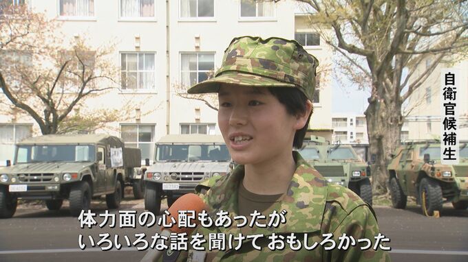 自衛官候補生「想像していたよりもかなり大きかった。驚きとかっこよさがあってかなり勉強になった」「普通科に行きたいと思っていた。体力面の心配もあったがいろいろな話を聞けておもしろかった」