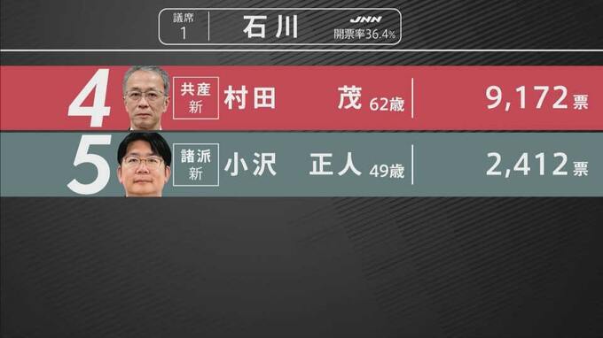 MRO 選挙情報(2025参議院選挙・石川県議補選) 【選挙速報】参議院選挙・石川県選挙区の開票状況(開票率36.4%) 2025年7月20日(日) 22:44 石川 参議院選挙、石川県選挙区の開票状況です。