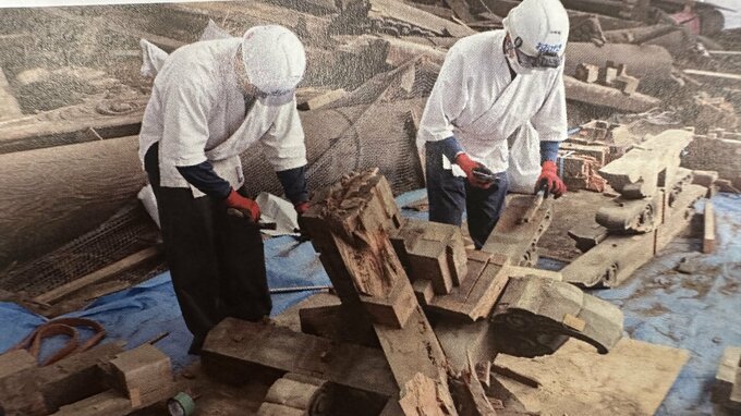 復旧作業の最初のステップは、倒壊した建物から部材を取り出し、それぞれに元々どの位置にあったかを示す印をつけて外していく作業。「部材に、どこにあっただろうという印をつけて外していくというのが、我々の設計管理の仕事」と遠藤さんは説明します。