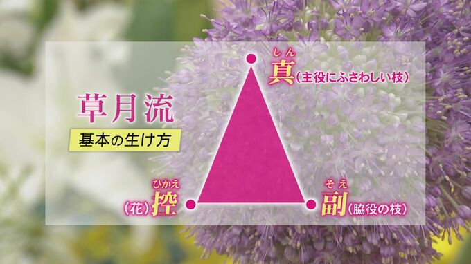 草月流では、軸を決める「真(主役)」「副(脇役)」「控(花)」という立体的な表現方法に沿って、剣山が二等辺三角形になるように生けるのが基本です。
