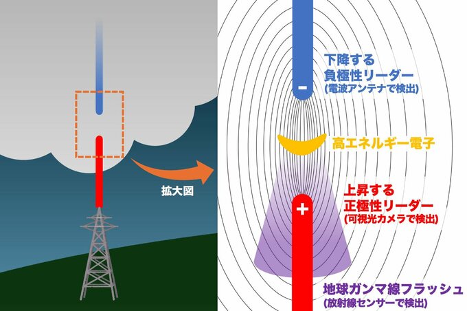 上下2つの放電がぶつかることで落雷になるのですが、地球ガンマ線フラッシュはわずかな秒数ではありながらもその前に観測されました。