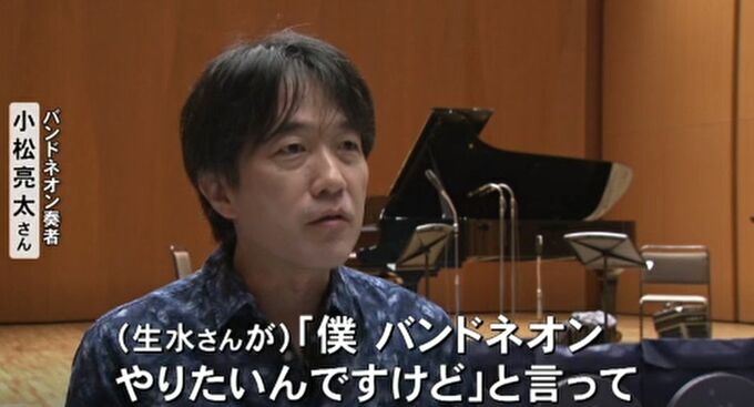 小松亮太さん「(金沢で)サイン会か何かあったのかな。(生水さんが)ぼくバンドネオンやりたいんですけどと言ってそれで1個ボロいバンドネオンを宅急便で送ってあげて、彼が僕の家にレッスンにくるようになった。バンドネオンでバッハを弾いてる人は昔アルゼンチンでアレハンドロ・バルレッタという巨匠の人がいるがその人の珍しいレコードを彼に聞かせたんですよね。そしたら急に目覚めちゃったみたいで、僕、クラッシックでバンドネオンを弾く男になりますとうことになっちゃって。」