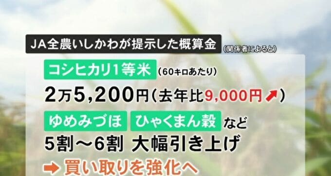関係者によりますと、JA全農いしかわが生産者に提示したコシヒカリ1等米の概算金は60キロ当たり2万5200円で、2024年より9000円高くなりました。