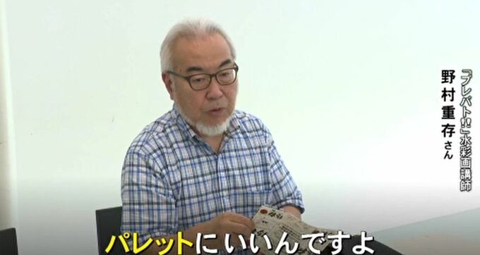 野村重存さん「牛乳パックって色々なものに使えるじゃないですか。パレットにいいんですよ。これ、汚いって言わない、『秘伝のたれ』。絵を描くときってきれいな絵の具だけで描けない。中間色と言っていろいろな色が混じりながら複雑な色になっている。これ洗っちゃうと一からこのタレを作らないといけないから大変。まさしく『秘伝のたれ』」