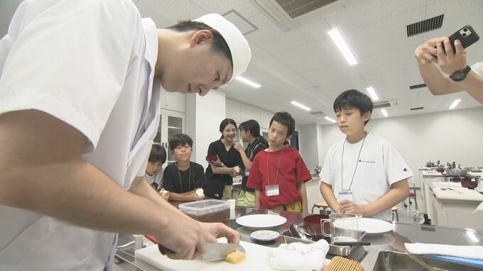 子供たちは美容師や伝統工芸など、人気が高く金沢にゆかりのある10種類の職業の中から興味のあるブースに分かれ、仏壇店の職人から金箔を貼るコツや、料亭の料理人から出汁を使った料理のポイントを教わりました。