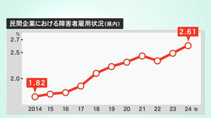 県内企業での実際の雇用率をグラフで見ると、2014年の1.82%から年々増加し、2024年は2.61%でした。また、県内でこの法定雇用率を達成した企業の割合は52.6%となっています。