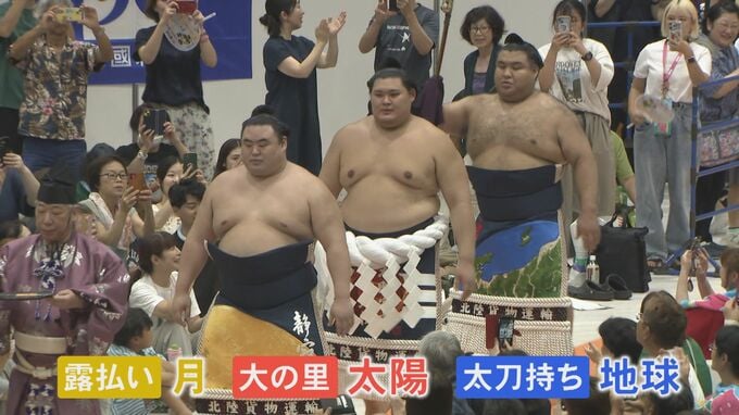 父・中村知幸さんの勤務先、北陸貨物運輸から贈られた3つぞろいの新しい化粧まわし。大の里のものには「太陽」太刀持ちは「地球」、そして露払いは「月」の絵柄があしらわれています。