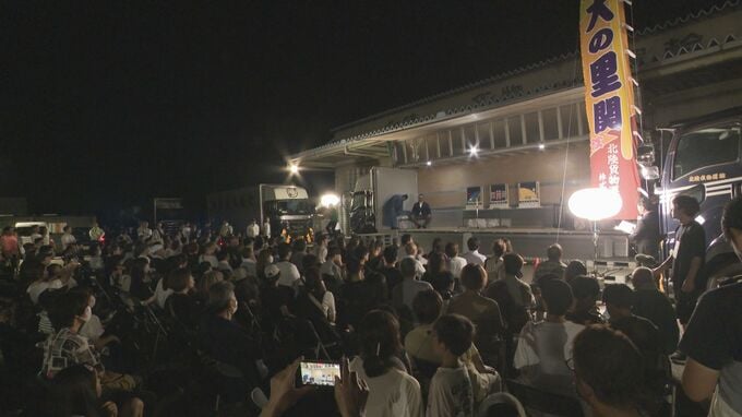 24日の夜に贈呈式が行われましたがステージはトラックの荷台でした。大の里と化粧まわしを見ようと大勢の人が訪れました。