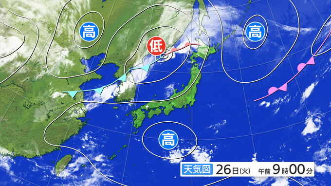 26日(火)午前9時の天気図です。沿海州付近に低気圧があり前線がのびています。前線の南側にあたる日本海から黄海にかけては発達した雲が広がっています。