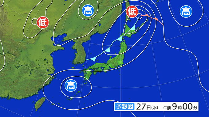 寒冷前線が山陰から九州の北にまでのびる見込みで、その後南下するでしょう。27日は日本海側を中心に雨が降り低気圧の中心に近い北日本では大雨のところがありそうです。