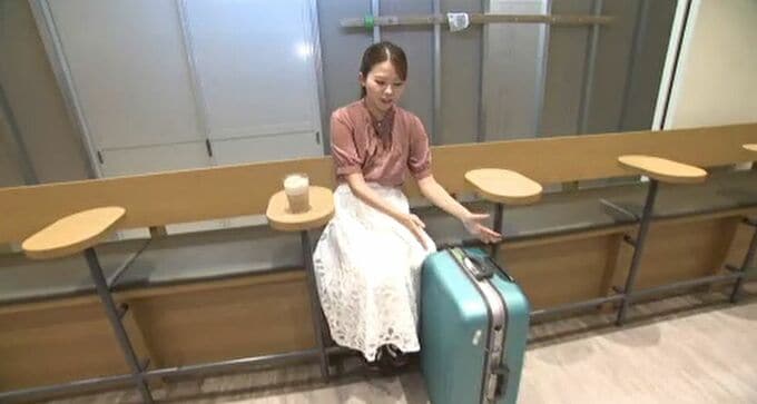 渡邉百音フィールドキャスター「内装の特徴は席幅が広いことこのようにスーツケースも余裕を持って収めることができる」スーツケースやお土産を持った利用客がスムーズに移動できるように店内は席間隔が他の店舗より広めに作られています。