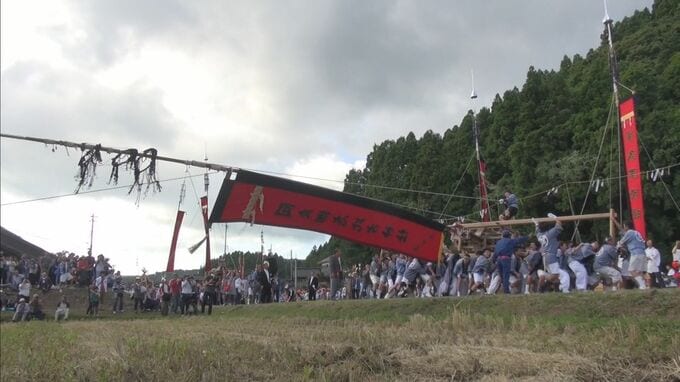 およそ400年の歴史をもち、毎年9月20日に行われる「お熊甲(くまかぶとまつり)祭」。見どころは、高さ20メートルある枠旗(わくばた)を地上すれすれまで倒す妙技「島田くずし」です。