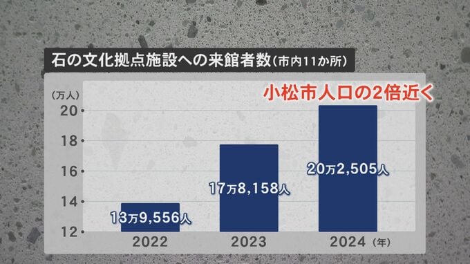 2022年は約14万人、2023年は約18万人、2024年は小松市の人口の2倍近い約20万人となっていて、「小松の石文化」への全国的な関心の高さがうかがえます。