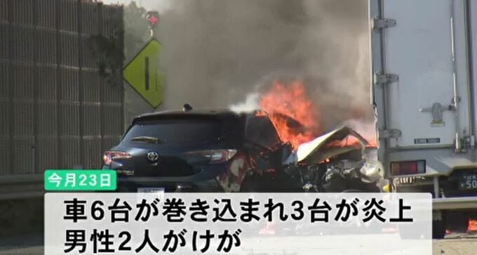 記者リポート「トラックを含む複数台事故が起きています。火災が発生しています。」