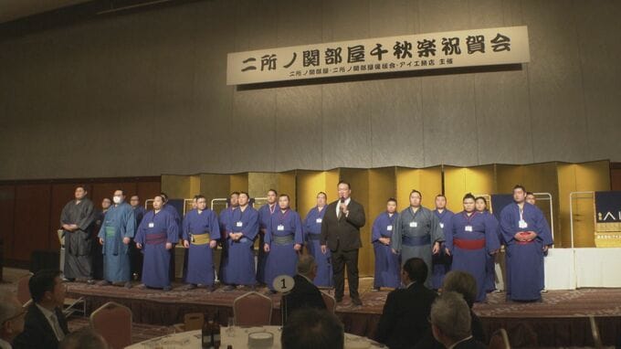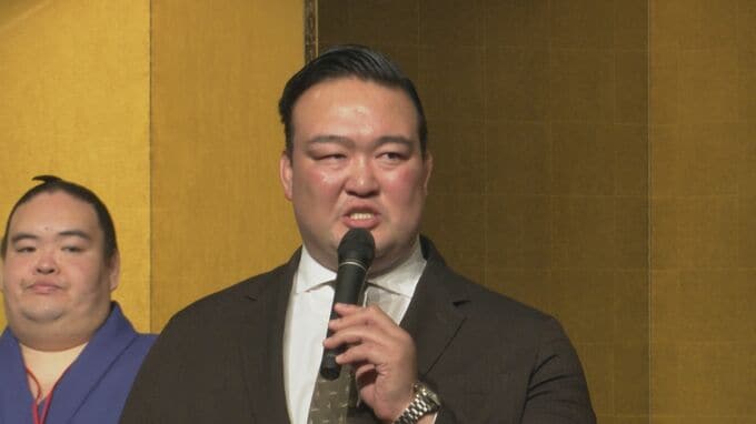 千秋楽後に福岡市内で開かれた祝賀会に姿を見せた横綱・大の里。13日目に安青錦との対戦で左肩を痛め、優勝争いをしていた23日の千秋楽で自身初の休場を決意しました。