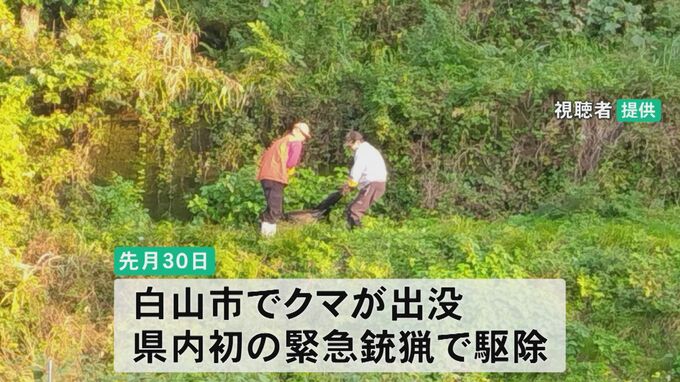 人里での目撃が相次ぐクマ。県内では2025年、19日時点で358件の目撃情報があり、10月30日には、白山市で住宅裏にクマが出没し、9月に制度が始まって以降初の緊急銃猟で駆除されました。