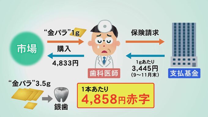 金パラが30グラムあたり14万円台となれば、1グラムあたりは4800円前後。しかし、医療機関に支払われる保険償還価格は1グラム当たり3445円(~11月末)です。この差額は1388円となり、被せの銀歯に使う金パラの量をおよそ3・5グラムとみれば、1本作るためにおよそ4800円を歯科医師側が持ち出すことになります。