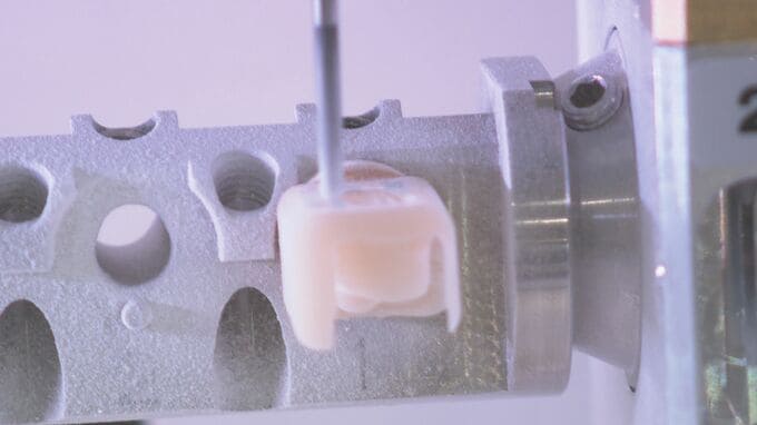 CAD/CAM冠は、まず、治療する歯をかたどった石膏をスキャンし、CAD(キャド)と呼ばれるシステムでコンピューター設計します。それをCAMと呼ばれる製造システムで削り、銀歯ではない被せものを作っていきます。