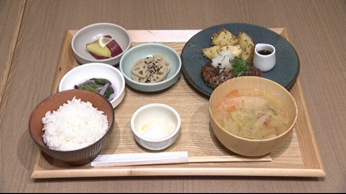 中でもおすすめメニューが能登牛と能登豚の自家製ハンバーグ定食です。絶妙なバランスの合いびき肉を使用したハンバーグに、県内の直売所から仕入れた「加賀れんこん」や「五郎島金時」など加賀野菜の総菜が季節折々に並びます。