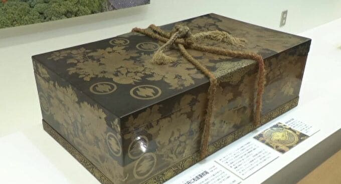 妙成寺に保管されている紋箱は、一面に牡丹の花が蒔絵で描かれ、取り付けられた細かな金具装飾にも技術の高さがうかがえます。