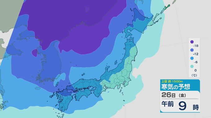 26日(金)は“寒気”と“冬型気圧配置”が強まり北陸など日本海側は大雪で荒れる天気に 交通障害など帰省への影響にも注意を 雪・雨と風シミュレーション 2025年12月24日(水) 15:41 石川 26日は寒気も強まりそうです。上空およそ1500メートルでは、西日本から北日本の広い範囲で、平地で雪が降る目安とされる-6度以下になる見込みです。